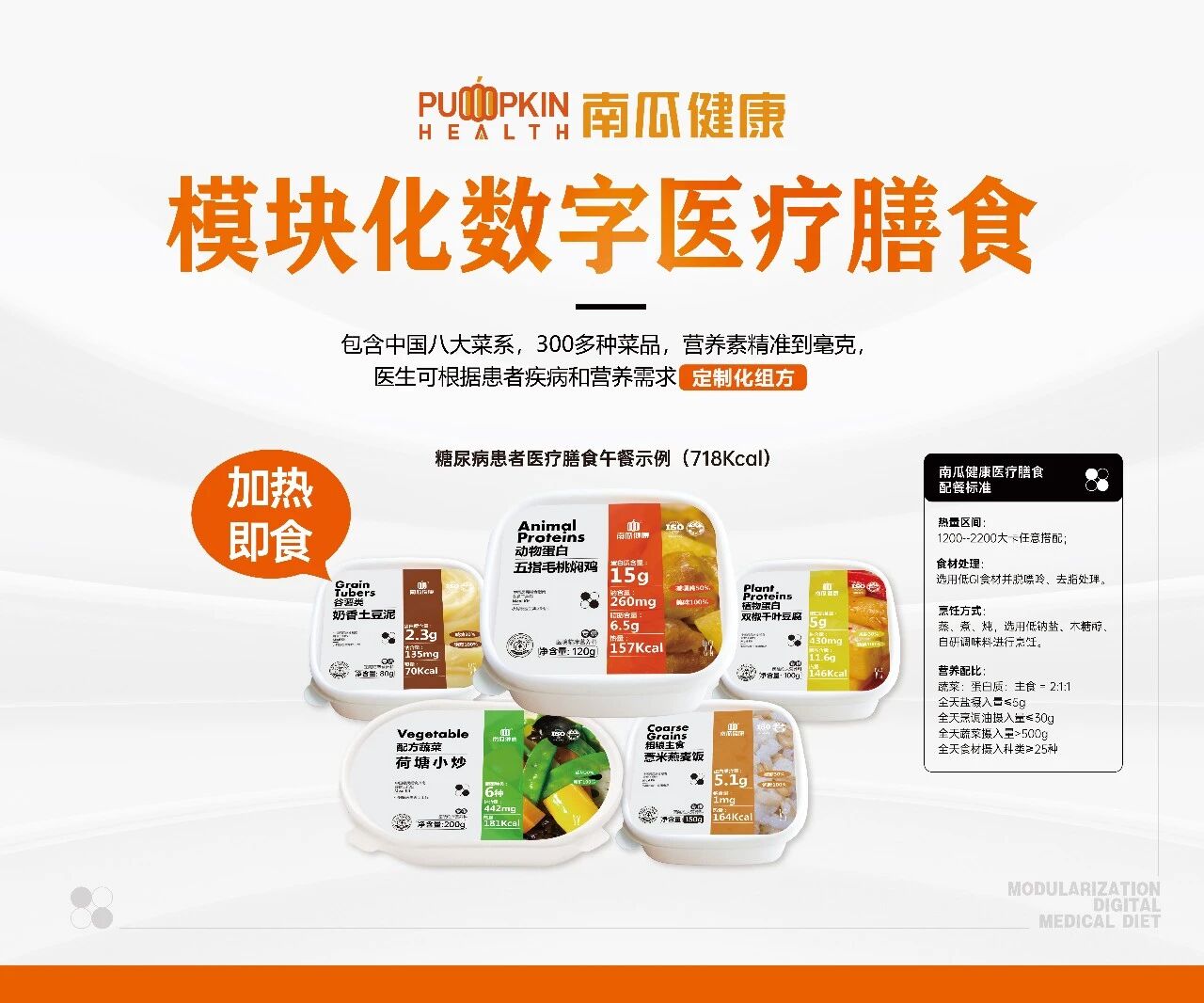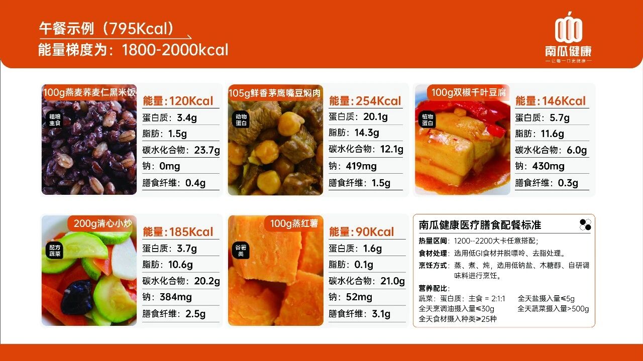 7年的沉淀与研究,我们根据用户的疾病需求、营养需求、能量需求研发和规模化生产了300多种精准营养的中国菜膳食工具包,定制化组成包括糖尿病医疗膳食、低蛋白医疗膳食、高蛋白医疗膳食、低脂医疗膳食、低胆固醇医疗膳食、低嘌呤医疗膳食、高膳食纤维医疗膳食、少渣医疗膳食、低盐医疗膳食、低钠医疗膳食、高钾医疗膳食、低钾医疗膳食。同时也根据用户个体差异化提供不同能量梯度的治疗膳食解决方案,主要分为1200-1399Kcal、1400-1599Kcal、1600-1799Kcal 、1800-2000Kcal,满足1200-2000kcal人群的需求。