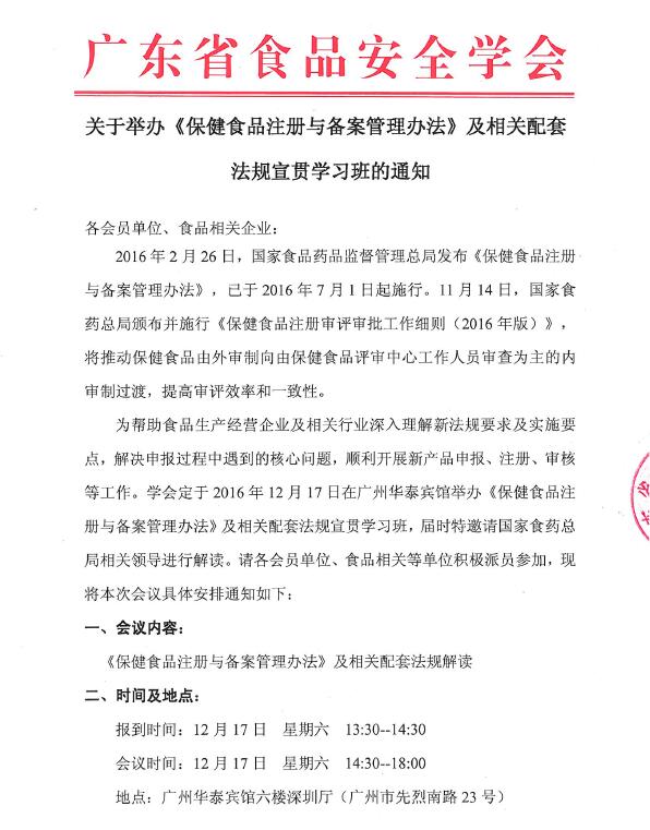 为帮助食品生产经营企业及相关行业深入理解《保健食品注册与备案管理办法》的要求及实施要点,顺利开展新产品申报、注册、审核等工作,学会定于2016年12月17日在广州华泰宾馆举办宣贯学习班,届时特邀请国家食药总局相关领导进行讲解。