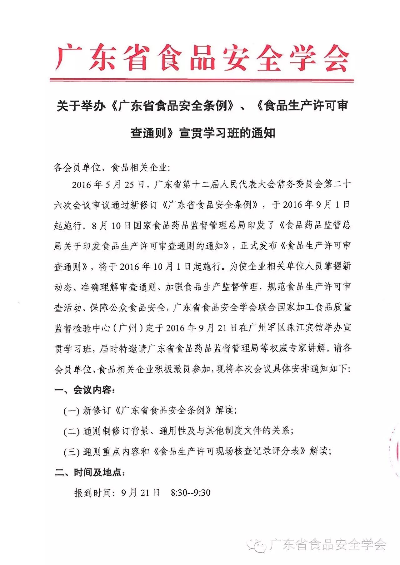 关于举办«广东省食品安全条例»、 «食品生产许可审查通则» 宣贯学习班的通知: